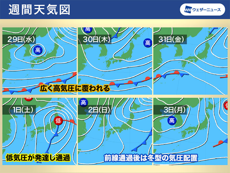 その後、31日(金)から11月1日(土)にかけては低気圧が発達しながら日本付近を通過する見込みです。