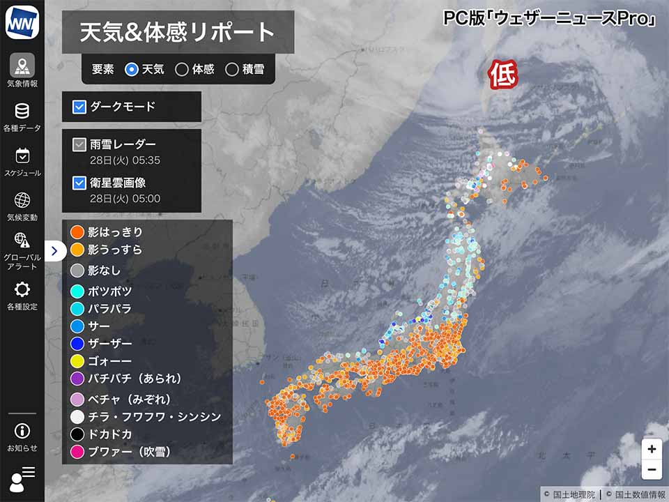 北海道では札幌周辺など平地でも雪になっています。室蘭や帯広では初雪が観測されました。積雪や路面凍結に注意してください。風も強く、横殴りの雨や雪となるところもあります。