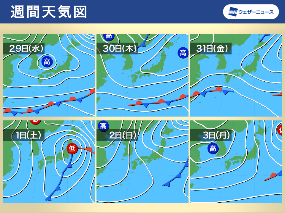 上空の寒気のピークからやや遅れて、30日(木)頃までは気温が平年より低めの日が続く予想です。週末は暖気の影響で気温が上昇傾向ですが、雨が降ると寒く感じるかもしれません。三連休最終日になると再び気温が下がります。