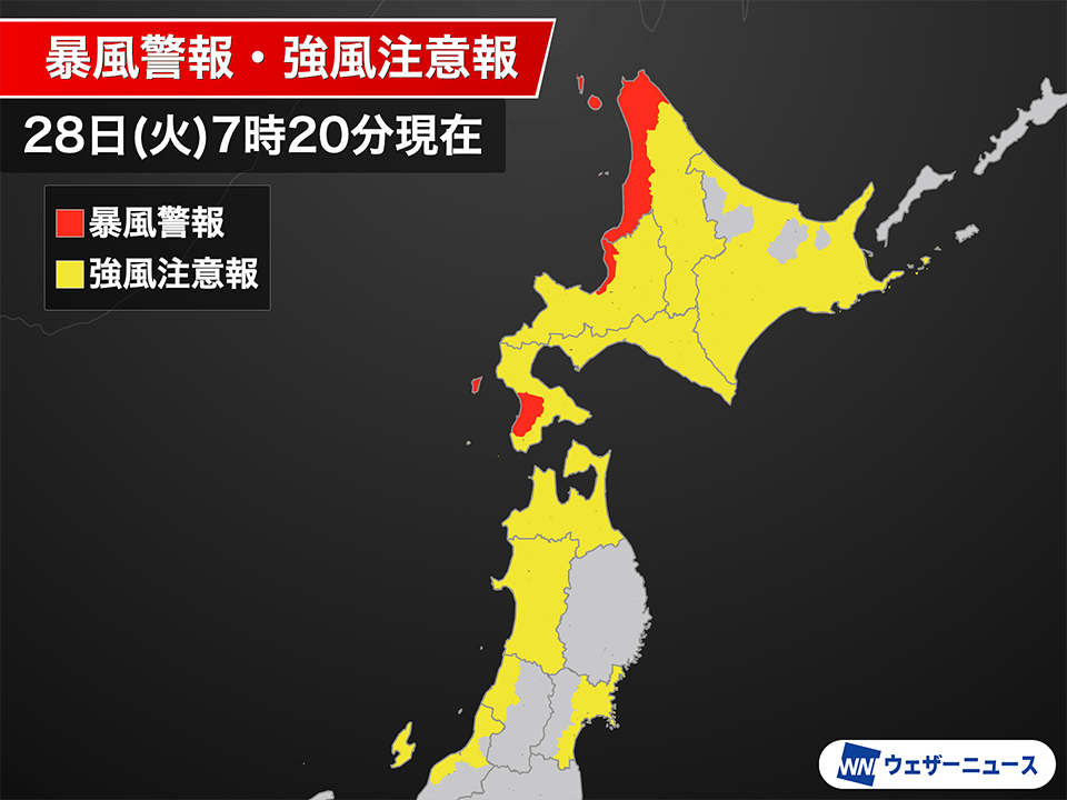 日本海側の沿岸には暴風警報や強風注意報の発表されているところがあります。車の運転操作や飛来物、停電等に注意してください。