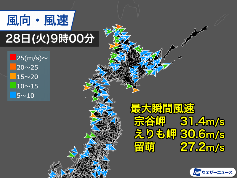 東西の気圧差が大きくなっている北海道では風が吹き荒れ、9時00分までの最大瞬間風速は稚内市・宗谷岬で31.4m/s、えりも町・えりも岬で30.6m/sなど一部で30m/sを超え、留萌市で27.2m/s、室蘭市で25.4m/sなど、市街地でも25m/s以上を観測しました。