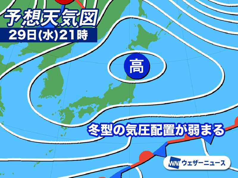 雪や雨が収まる分だけ昼間の気温は昨日28日(火)と同じか少し高く、若干寒さが和らぎそうです。