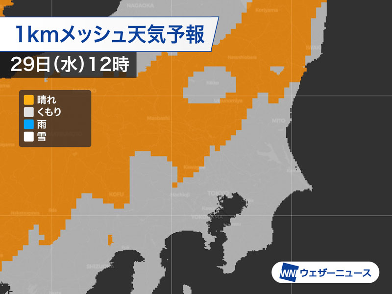 関東は前線帯の影響で南部を中心に雲が広がりやすくなります。夜は沿岸部でポツポツと雨の降る可能性も。