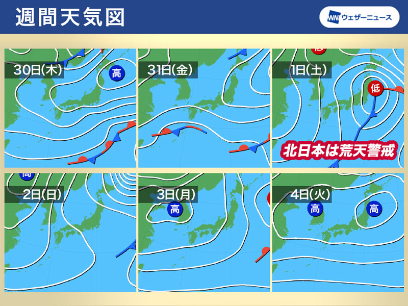 三連休の初日となる1日(土)は低気圧が発達しながら通過する東北や北海道で雨や風が強まり、荒れた天気となるおそれがあります。大雨になる可能性もあるので今後の情報に注意してください。