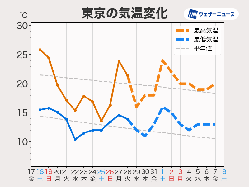 上空の寒気のピークからやや遅れて、30日(木)頃までは気温が平年より低めの日が続く予想です。週末は暖気の影響で気温が上昇傾向ですが、雨が降ると寒く感じるかもしれません。三連休最終日になると再び気温が下がります。