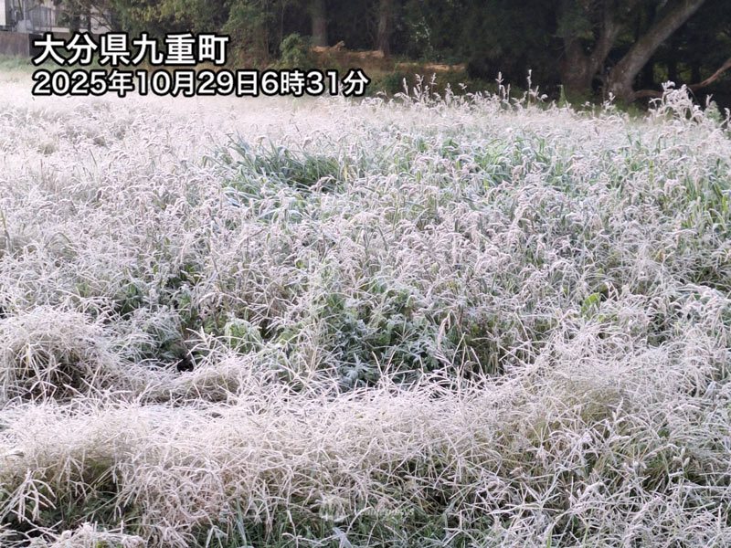 今朝の冷え込みによって、大分県の九重町では、一面に霜が降りた写真が撮影されました。今季から気象庁は官署や測候所での初霜・初氷の観測情報の発表を行わなくなりましたが、写真を撮影した方からは「初霜」とのコメントが添えられていました。
