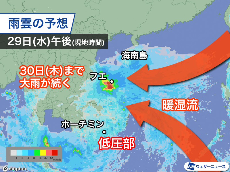 今日29日(水)も湿った空気の流入は継続していて、断続的に強い雨が降る見込みです。30日(木)の夜にかけてベトナム中部では100〜200mmの雨が予想され、局地的には400mmに達するとみられます。