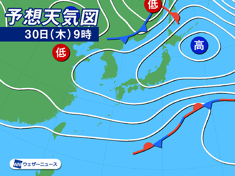 全国的に晴れる所が多い 朝と昼間の気温差大