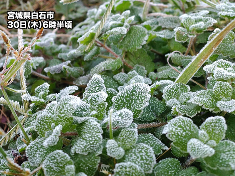 今朝の冷え込みによって、各地で霜の降りた様子の写真が撮影されました。今季から気象庁は官署や測候所での初霜・初氷の観測情報の発表を行わなくなりましたが、写真を撮影した方からは「初霜」とのコメントが添えられていました