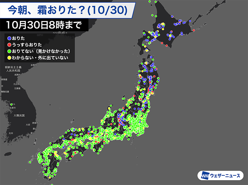 ウェザーニュースアプリ利用者に「今朝、霜は降りましたか?」と聞いたところ、北海道や東北、東日本の内陸から「おりた」「うっすらおりた」との報告が多く寄せられました。