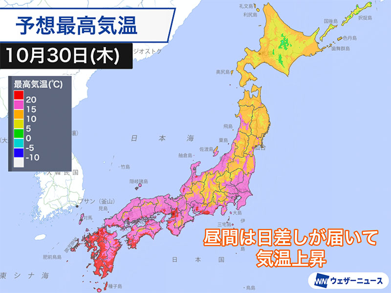 朝は冷え込んだ日本列島ですが、冬型の気圧配置が弱まり高気圧に覆われるため、昼間は広範囲で日差しが届き気温が上昇します。
