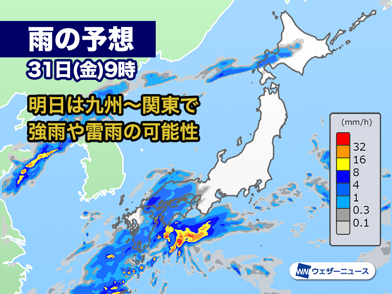 九州や四国では昼間のうちは大きな天気の崩れはないものの、夜は湿った東風の影響で雲が広がってきます。太平洋側では雨の降り出すところがあり、遅い時間ほど雨の範囲が拡大する見込みです。