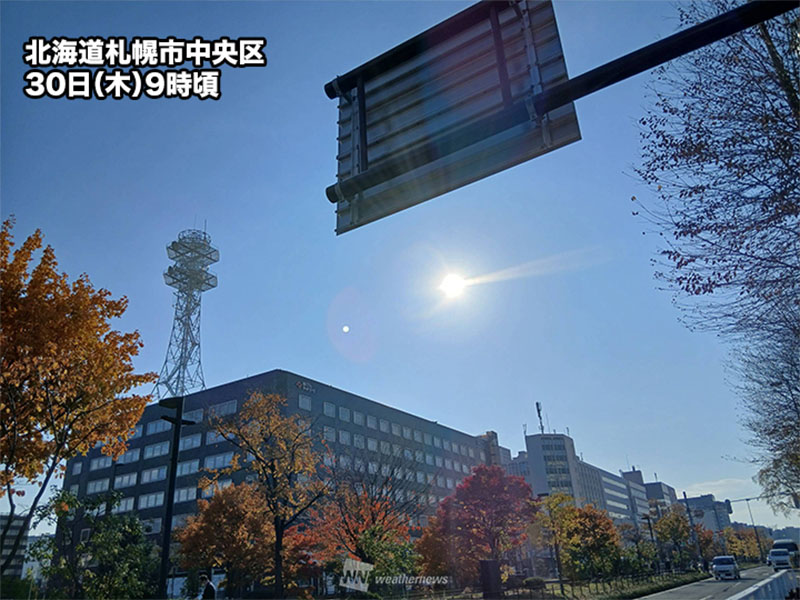 今日30日(木)の朝は冷え込みが強まり、北海道の陸別町では今季全国で最低の-7.5℃を観測しました。