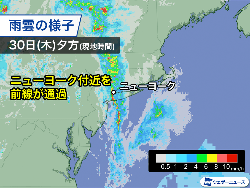 低気圧から伸びる前線が現地時間の30日(木)午後にニューヨーク付近を通過しました。