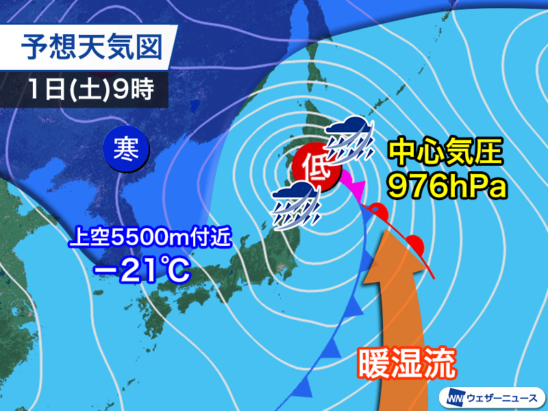 低気圧の南から暖かな空気が流れ込む一方で、北からは上空5500m付近で−21℃以下の強い寒気が南下してきます。大きな温度差によって低気圧は急速に発達する見込みです。
