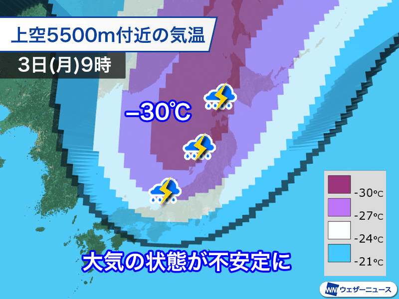 2日(日)夕方からは寒気の影響で大気の状態が不安定
