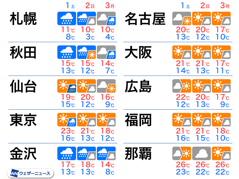 明日1日(土)から2日(日)は気温が高めで、最高気温は20℃を超えて過ごしやすい陽気になります。最終日の3日(月)文化の日は寒気が南下する影響で気温が上がりにくく、朝晩は冷え込みますので、服装に注意をしてください。