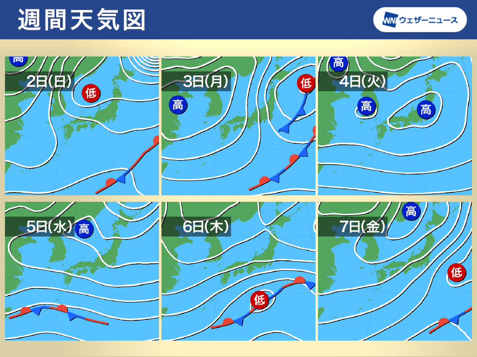 連休2日目の2日(日)になると、低気圧は東へ離れ、日本付近は冬型の気圧配置へ移行します。また、日本海では複数の低気圧が発生し、北日本付近を通過するとみられ、日本海側では一時的に強い雨や雷を伴うおそれがあります。