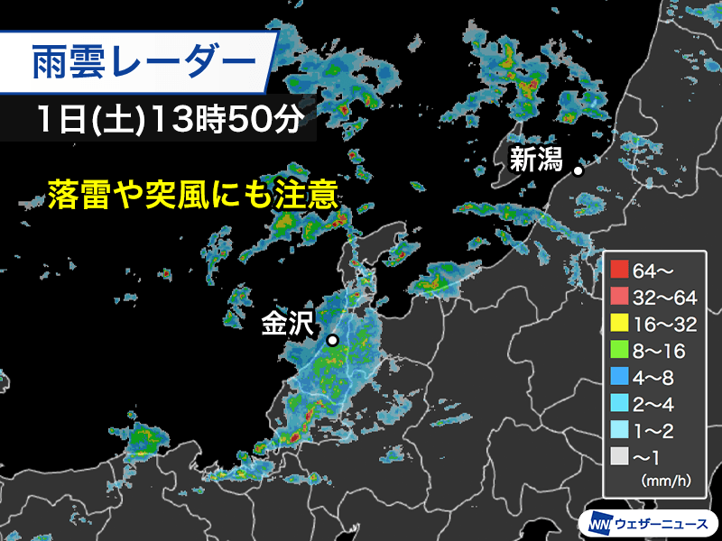 局地的に雨が強まり、雷を伴っている状況です。金沢市からはろうと雲が見られ、発達した雨雲の周辺では短時間の強い雨に加え、落雷や竜巻などの突風にも注意が必要です。