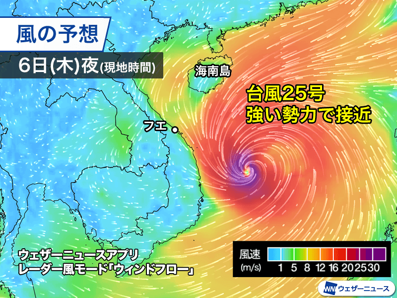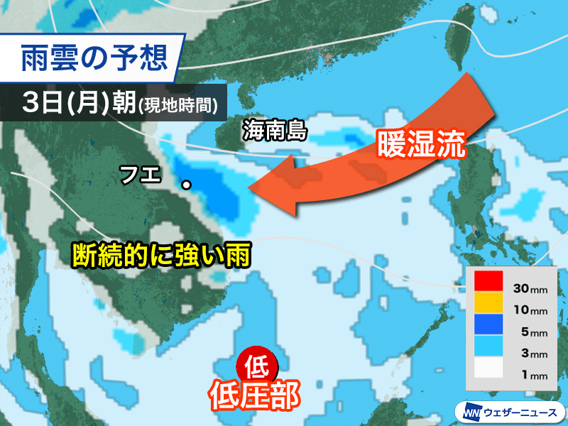 南シナ海の低圧部がゆっくりと西に進んでいます。低圧部の北側を吹く東寄りの風がベトナムに湿った空気を次々に送り込み、雨が強まっている状況です。現地時間の2日(日)朝までの24時間にはベトナム中部のフエ市やダナン市の観測点で120mm前後の雨量を観測しています。