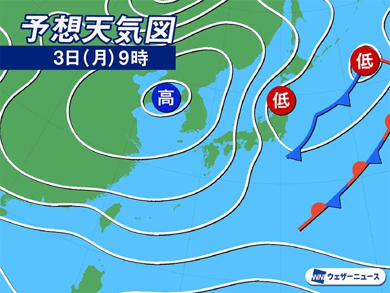 日差しが届いても気温は昨日2日(日)ほどは上がらず、20℃に達するかどうかです。北寄りの風も強めに吹いて体感温度は低めですので、服装選びにご注意ください。