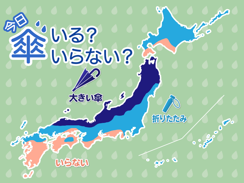 本州の太平洋側や九州北部付近でも急な雨の可能性があります。日差しが届いても油断禁物。折りたたみ傘をお持ちください。