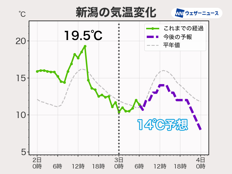 予想最高気温は秋田市で13℃(前日比−4℃)、新潟市で14℃(前日比−5℃)、大阪市で18℃(前日比−3℃)です。