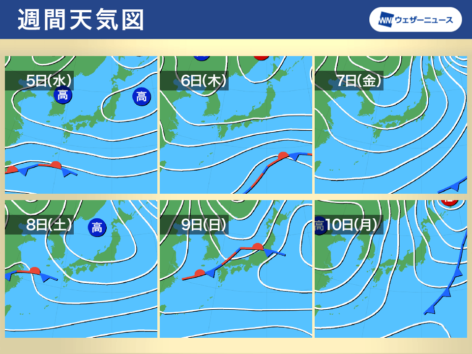 8日(土)にかけて本州付近は移動性高気圧に覆われる日が多く、太平洋側を中心に晴天が続きます。