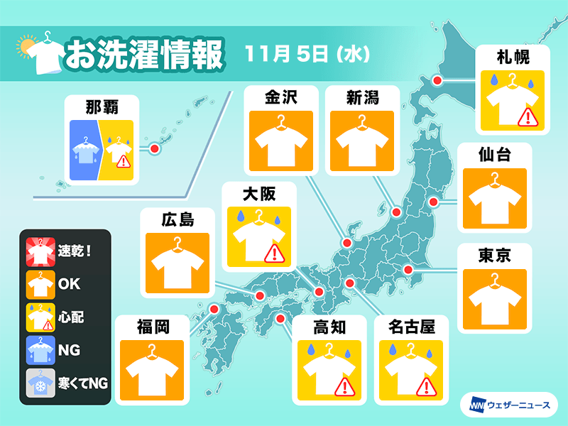 今日5日(水)は、日本海側や東北を中心に日差しが届き、外干し日和となります。厚手の洗濯物もよく乾きそうです。
