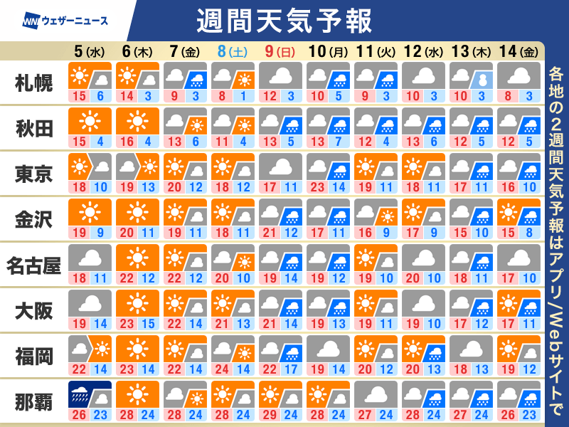 晴れる日が多いため、朝は放射冷却により冷え込みが強まります。ただ、昼間は日差しが届いて気温が上昇し、特に西日本では夏日になるところもありそうです。一日の気温差が大きくなるため、上着などで体感を調節してください。
