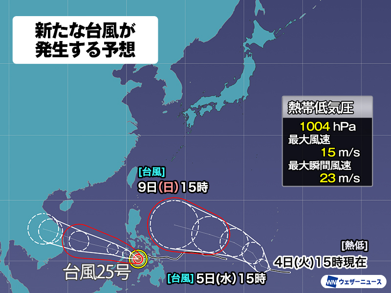 気象庁の発表によると昨日3日(月)21時に発生したこの熱帯低気圧は、今後勢力を強めて24時間以内、明日5日(水)の15時までに台風に発達する予想です。その後も発達しながら西寄りに進み、9日(日)には強い勢力でフィリピン東の海上に達するものとみられます。