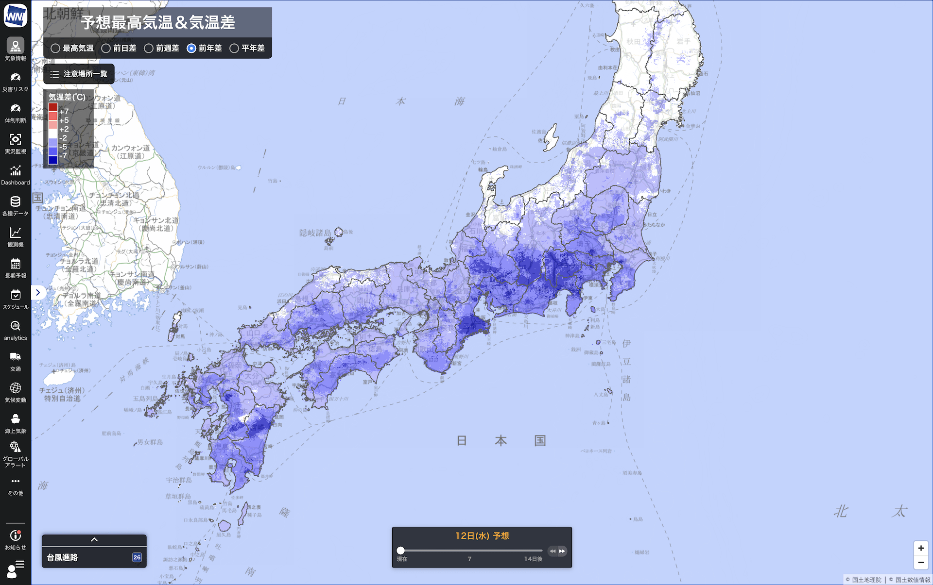 冬型の気圧配置に伴う寒気の流入で本州では気温が低下しました。特に東日本から西日本にかけては、広く予想最高気温の前年差が低い予想となりました。