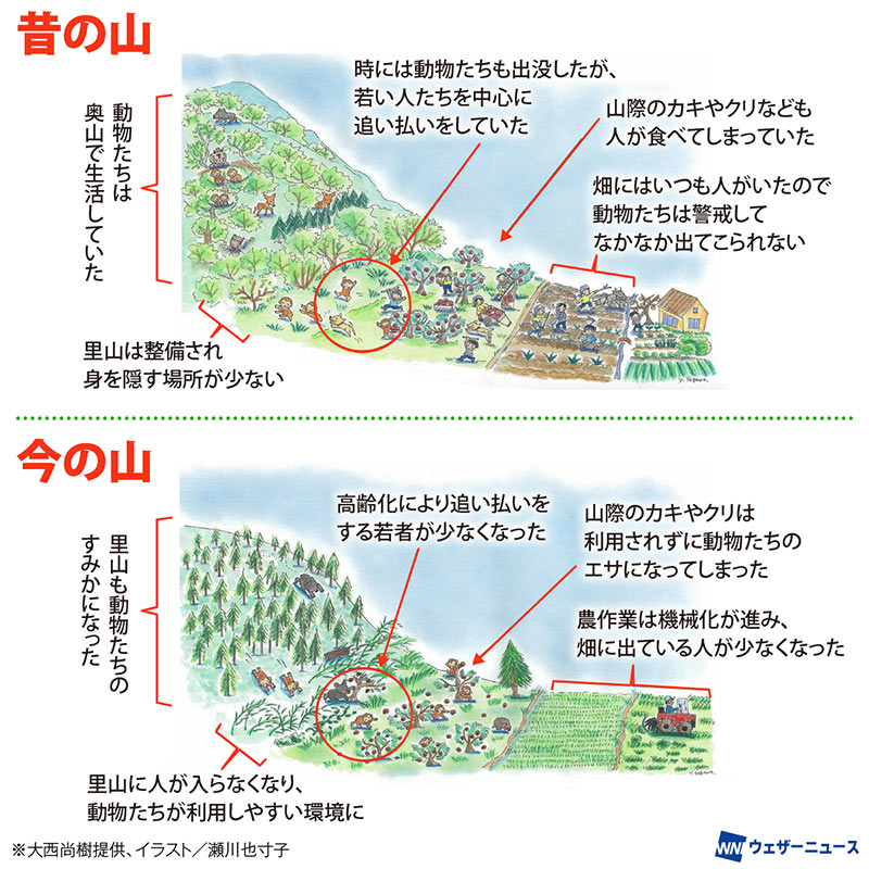 「人の生活や活動範囲が、かつてとは変わったことです。昔は、人里とクマなどが生息する奥山の間には、里山がありました。山際の柿の木や栗の木は貴重な資源であり、里山はよく整備されていました。