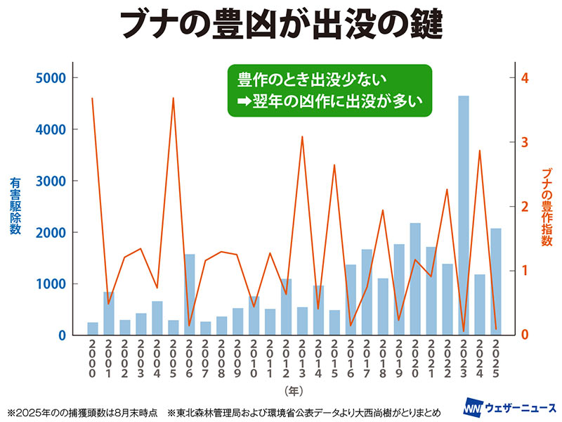大西尚樹「なぜクマの出没が増えている? 温暖化でますます増える!?」、環境省「クマ類の生息状況、被害状況等について」