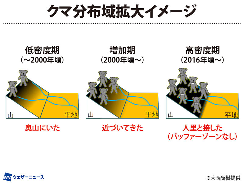 動物の生息するエリアと人間の生活するエリアが近接し、人里にクマが少しはみ出してくるという状況が生まれました」(大西さん)
