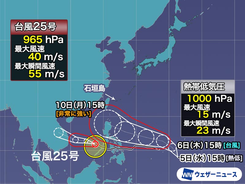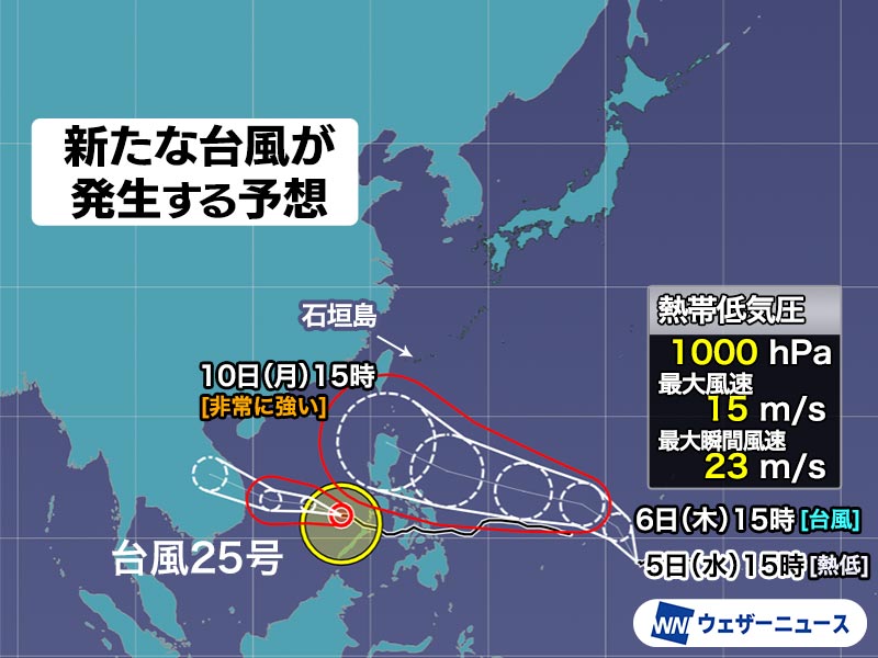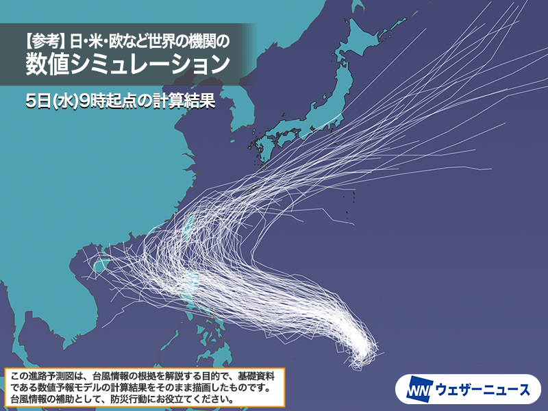 ただ、その後の進路はまだ不確実で、そのまま西寄りに進んで南シナ海方面に向かう可能性も、北寄りに転向して沖縄の南へ北上する可能性も考えられます。