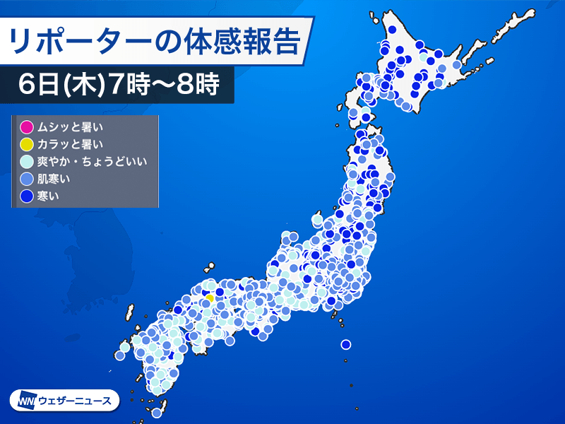 ウェザーニュースアプリの利用者からの体感リポートでも「肌寒い」「寒い」との回答が目立ちました。