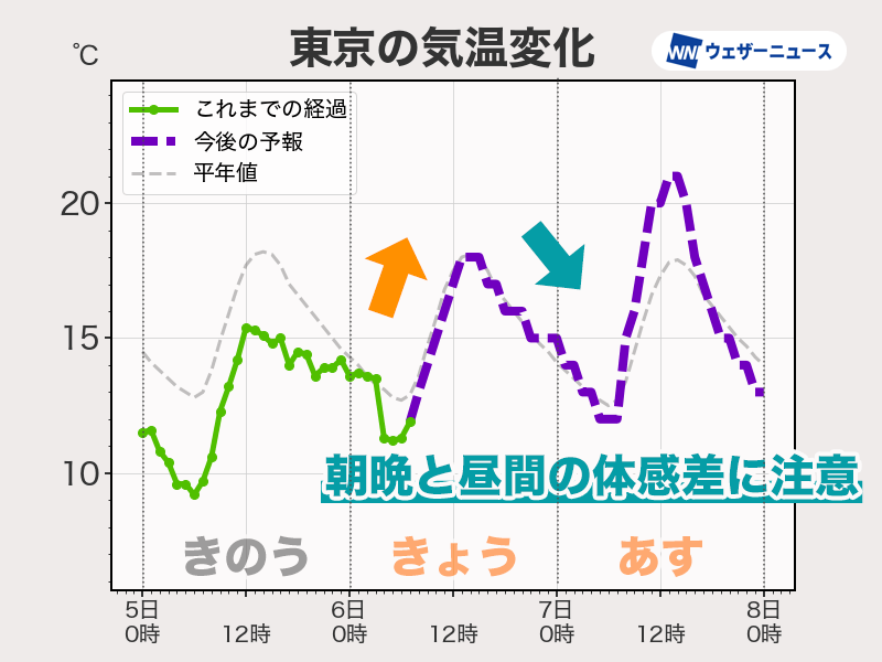 ただ、夕方以降は再び冷え込み、ヒンヤリとした体感に戻ります。朝晩と昼の気温差が10℃近くになる所が多くなりますので、上着などで調節を行い、体調管理にお気をつけください。