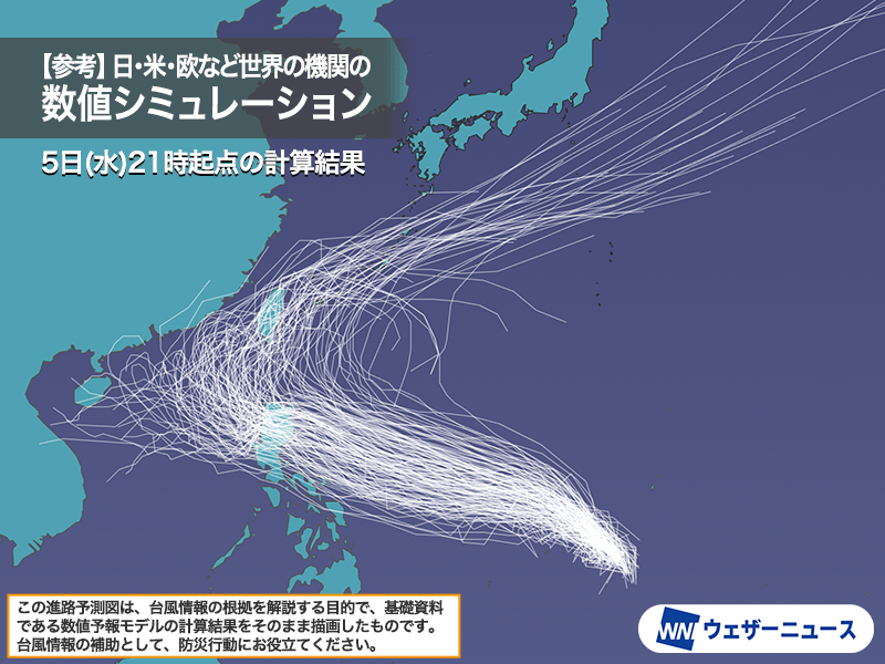 これらを比較すると、しばらくは西北西に進む傾向は揃っているものの、フィリピンのルソン島付近からは予測のばらつきが大きくなっていることがわかります。南シナ海や台湾周辺で中心の追跡が終了している予測もあれば、日本の南を東進する進路を予測しているものもあります。