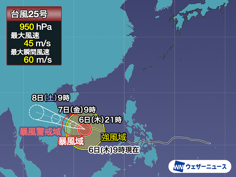 6日(木)9時現在、台風25号は非常に強い勢力を保ちながら南シナ海を西に進んでいます。