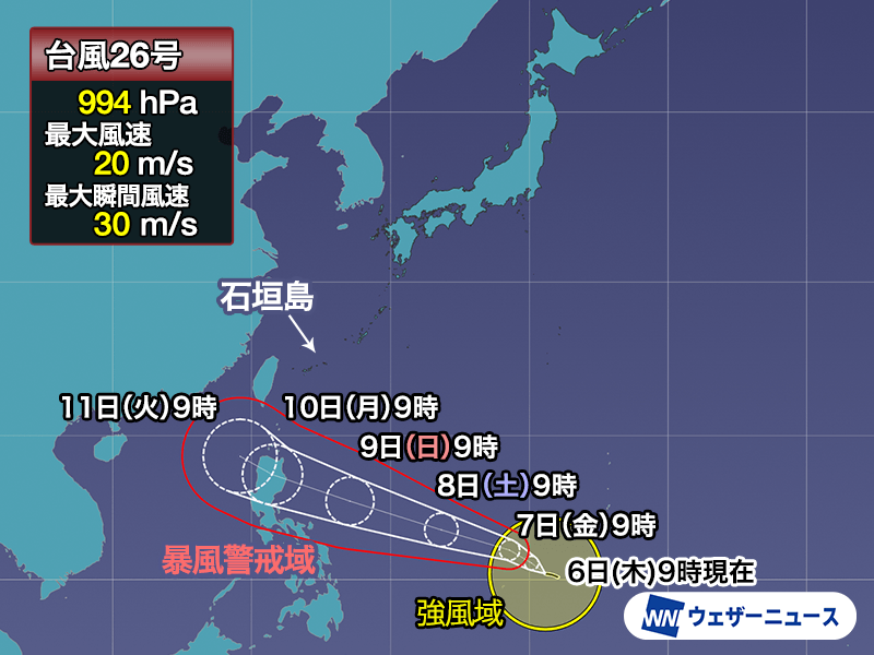 9時現在、台風26号は発生当時よりもやや発達してマリアナ諸島周辺の海上を北西に進んでいます。今後はさらに発達しながら北西に進み、10日(月)頃には強い勢力でフィリピンのルソン島に接近する見通しです。