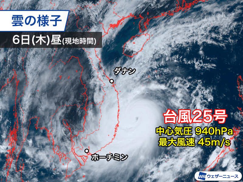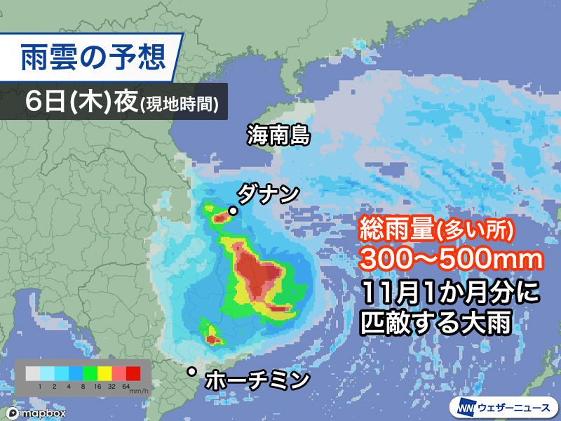 ベトナムの南部では台風の通過に伴って大雨になる見通しで、多い所では総雨量が300〜500mmほどに達するとみられます。このエリアの11月1か月の平年雨量に匹敵する雨量で、大規模な洪水や土砂災害などのおそれがあります。