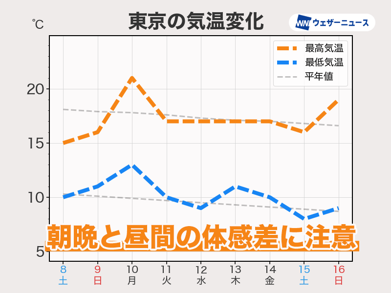 晴れる日が多いため、朝は放射冷却により冷え込みが強まります。ただ、昼間は日差しが届いて気温が上昇する予想です。一日の気温差が大きくなるため、上着などで体感を調節してください。