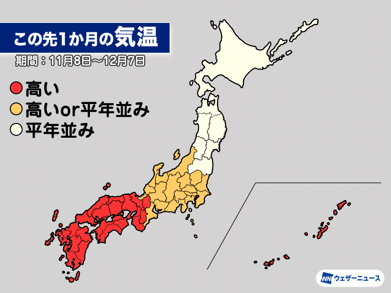 この先1か月の上空の気温は大陸からの寒気の南下が弱く、西日本から南西諸島を中心に高くなります。そのため、平均気温は西日本や沖縄・奄美では平年よりも高く、東日本では平年並みか平年より高くなる予想です。