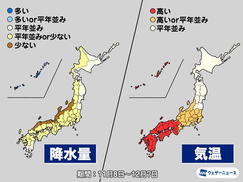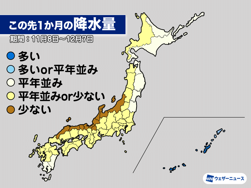 冬型の気圧配置になりにくいため、日本海側の降水量は平年を下回る予想です。