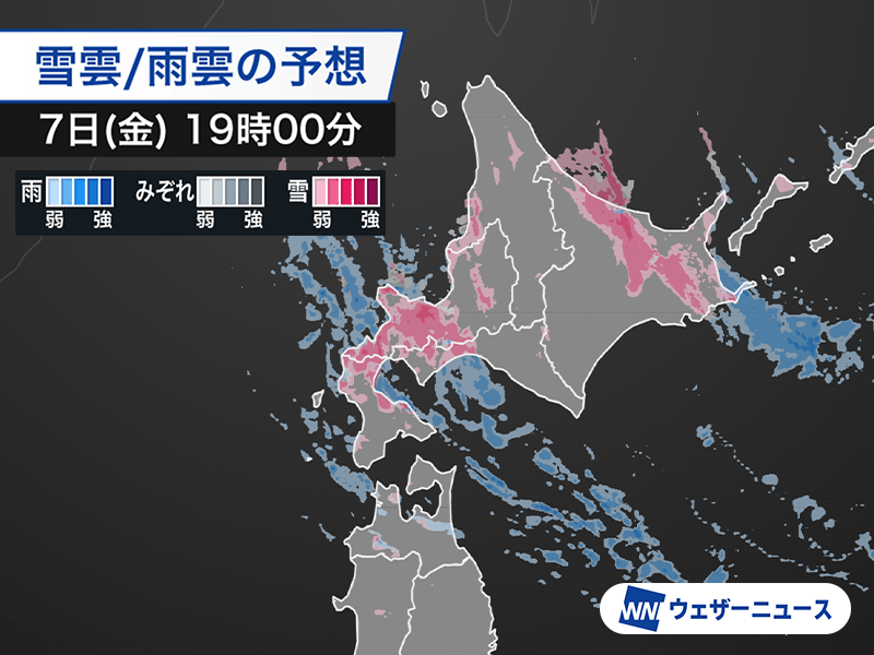 明日8日(土)の朝にかけては札幌市内など市街地でも路面に雪が積もり、山沿いでは積雪が増えて大雪となるおそれがあります。