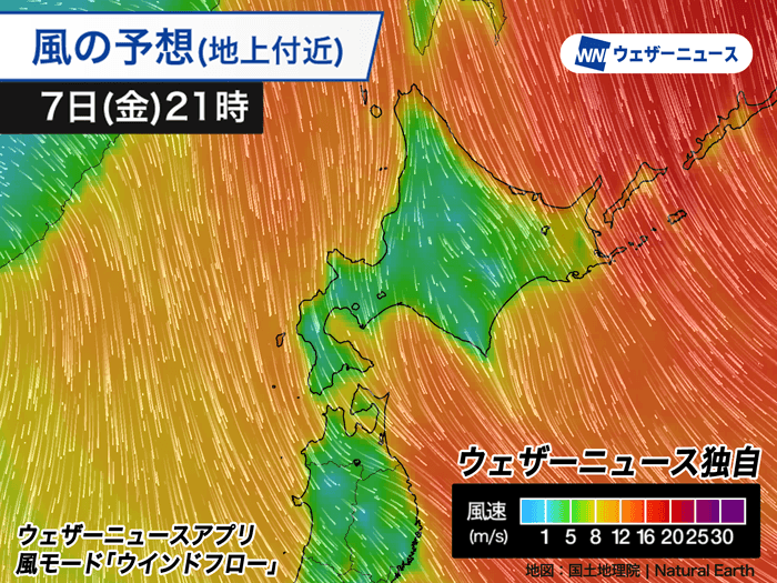 北海道では等圧線が混み合い沿岸部を中心に北寄りの風が強く吹いています。札幌市中心部でも、15時頃に最大瞬間風速23.6m/sを観測しました。
