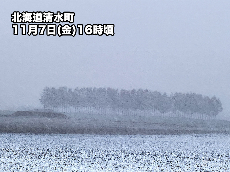 今日7日(金)17時には、上川町層雲峡で8cm、幌加内町で4cm、紋別空港で3cm、女満別空港でも1cmの積雪を観測しています。北海道では山間部から雪が積もり始めました。札幌市郊外でも白くなりはじめたところがあります。