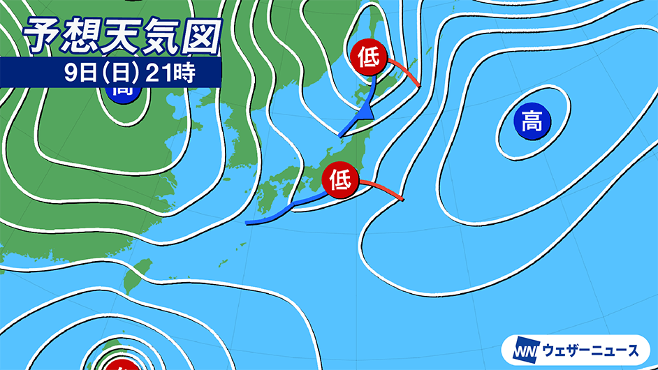 今日は前線が東シナ海にのびてきて、前線上に低気圧が発生して東進します。明日9日(日)は低気圧が西日本から東日本に進み、西日本や東日本は広範囲で雨が降る予想です。