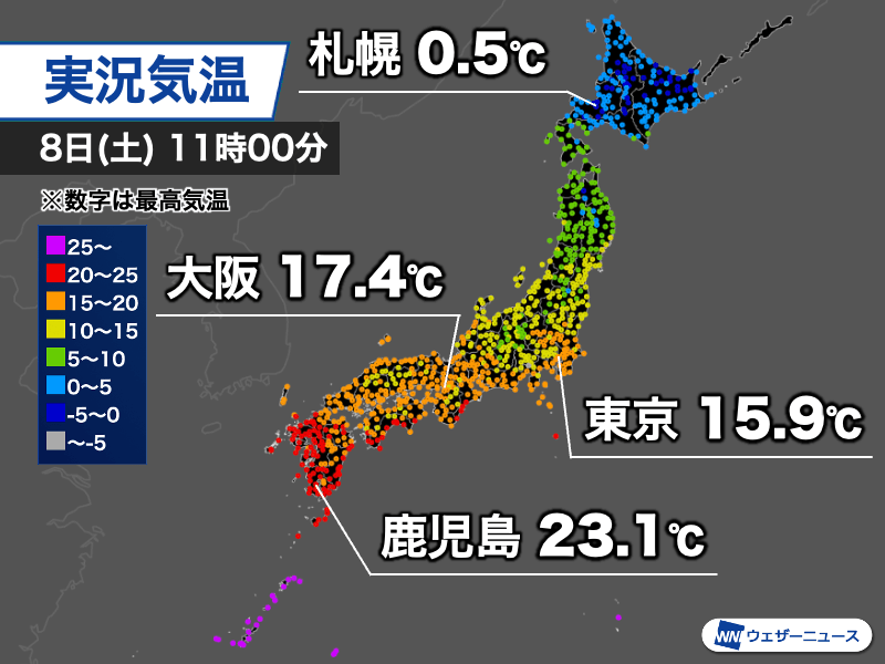 北日本は昨日7日(金)日中から寒気が強まり、11時時点で上空1500m付近の0℃線が東北南部付近まで、−6℃線(平地で雪の降る目安)が東北北部付近まで、−12℃線が道北〜道東オホーツク海側まで南下しています。このため気温が上がらず、11時までの最高気温は札幌で未明に観測されていた0.5℃、青森で8.4℃、仙台で11.7℃となりました。